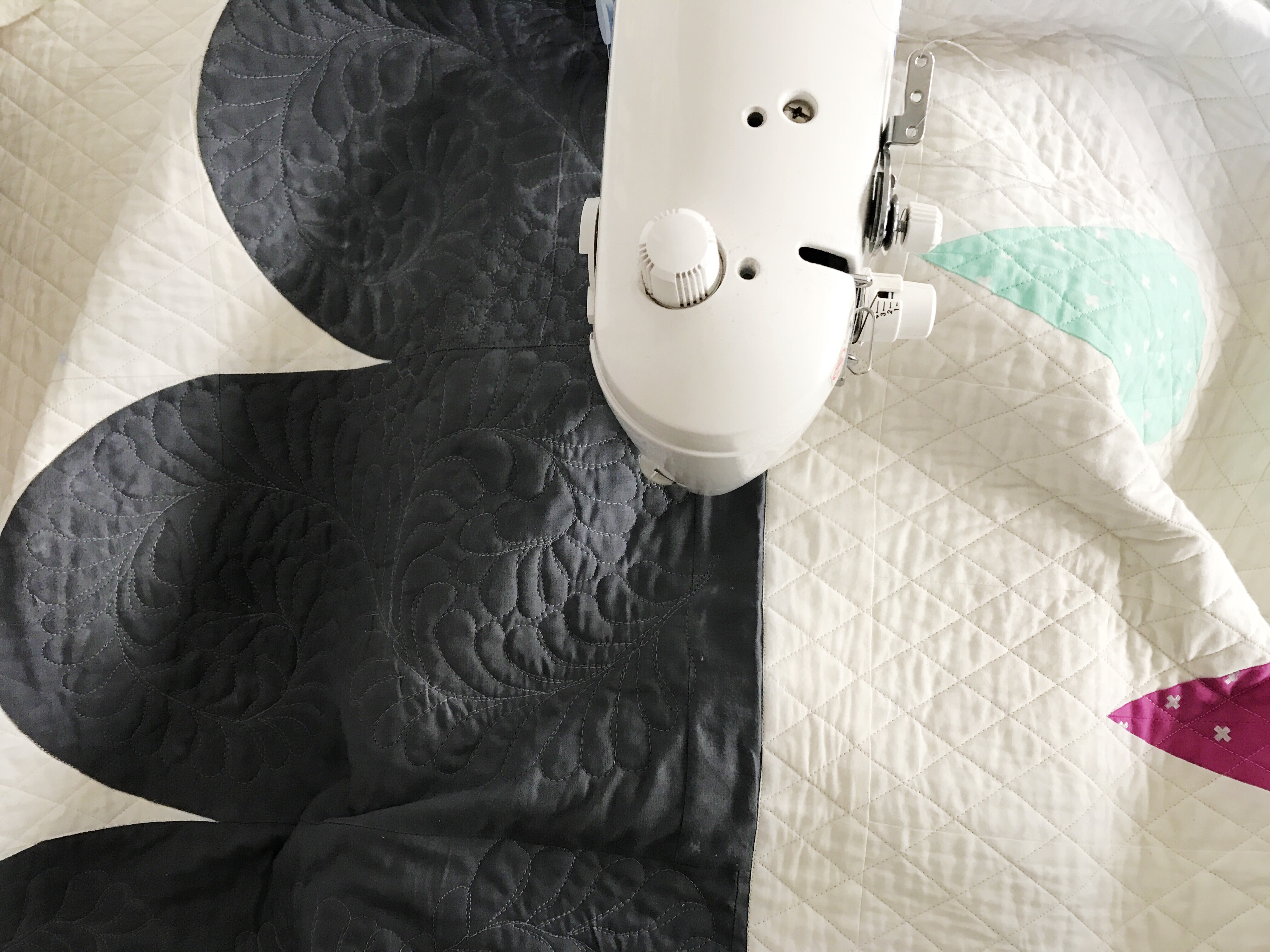 Is am adding small pebbles as a filler around the feathers, and this quilting will be done! I can’t wait to share it with you all!